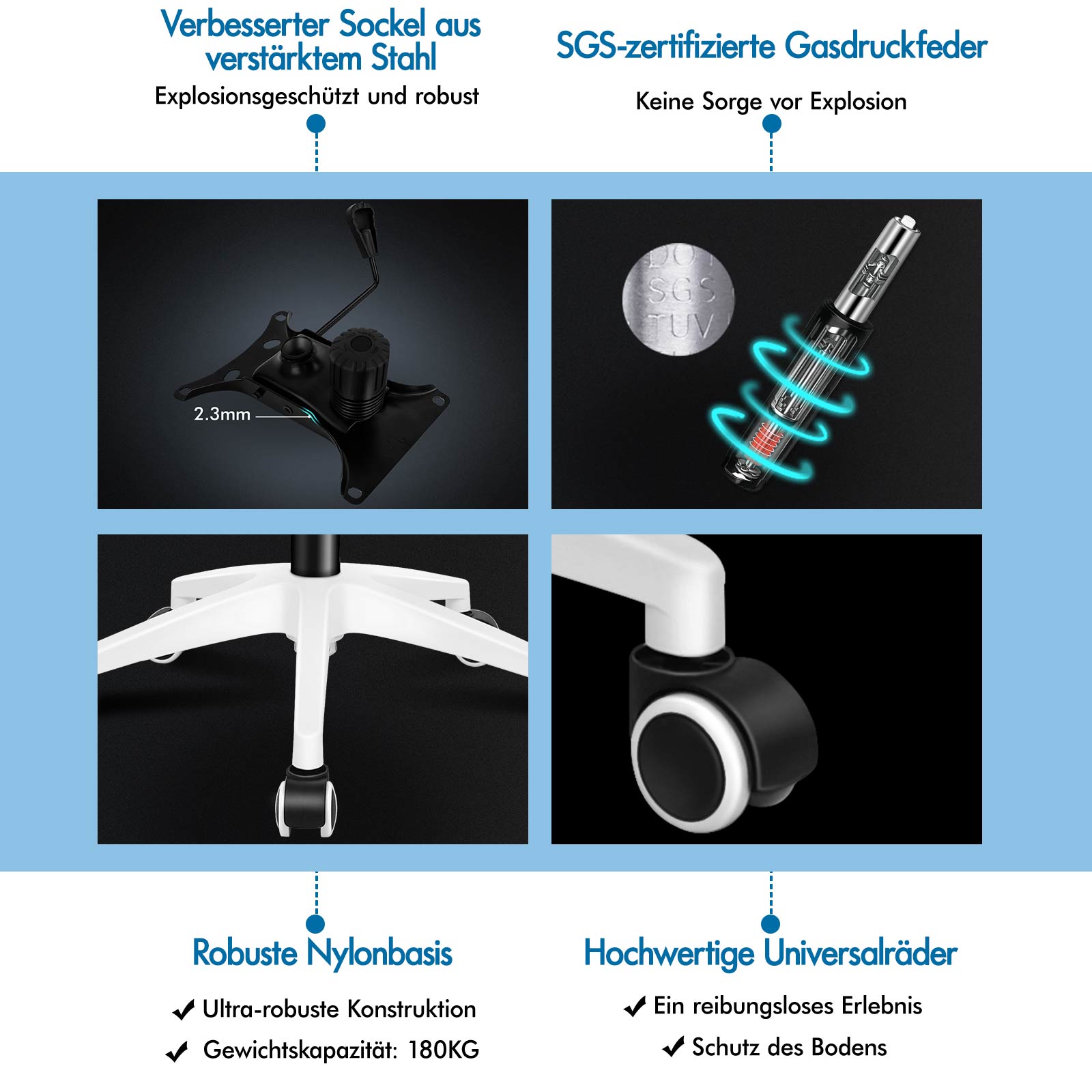 Spezifikationen * Intertek-geprüftes Supreme-Mesh-Gewebe * SGS-geprüfter Gaslift, keine Angst vor Explosionen * TUV-geprüfte Lenkrollen * Dreischichtiger Sitz: Mesh-Gewebe + elastischer Schaumstoff + Holzplatte * Hohe Tragfähigkeit: 180kg * 1 Jahr Garantie* Farbe: Schwarz, Schwarz & Weiß, Schwarz & Dunkelgrau, Weiß & Hellgrau, Rot, Rosa, Blau, Blau und Grau, Cyan* Abmessungen: 62 x 62 x 108~128cm* Detaillierte Größen siehe Foto der Abmessungen