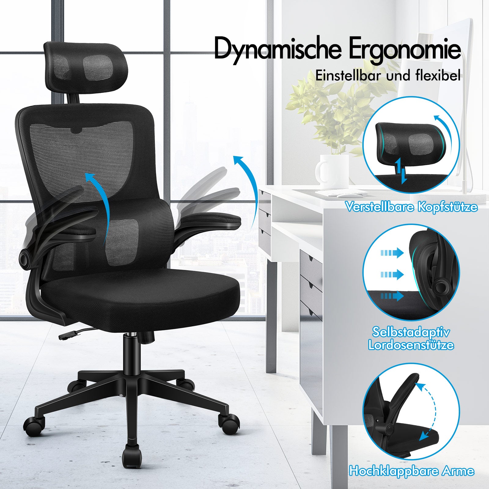 * Selbstanpassende Lendenwirbelstütze für optimalen Komfort* S-förmiges Design für optimale Körperanpassung * Winkel- und höhenverstellbare Kopfstütze* Entfernen Sie die Kopfstütze, wenn Sie einen Stuhl mit mittelhoher Rückenlehne bevorzugen* Netzrückenlehne und Stoffsitzpolsterung, hoch atmungsaktiv * Einziehbare Armlehnen für die Montage unter Ihrem Schreibtisch * Stilvolle Armlehnen mit Polsterung, breit und stützend * Großzügige Polsterung mit hochelastischem Schaumstoff * Entlastet Rücken- und Schulterdruck * Flexible Neigungsverstellung * Breitere und höhere Rückenlehne, wir kürzen sie nicht, um Kosten zu sparen* Hochwertige Universalräder, ein reibungsloses Erlebnis * Nylonbasis in einzigartiger geschwungener Form * Sanfte 360-Grad-Drehung * Robuste Materialien aus Metall und Nylon * Ideal für das Homeoffice, Gamer und den geschäftlichen Einsatz