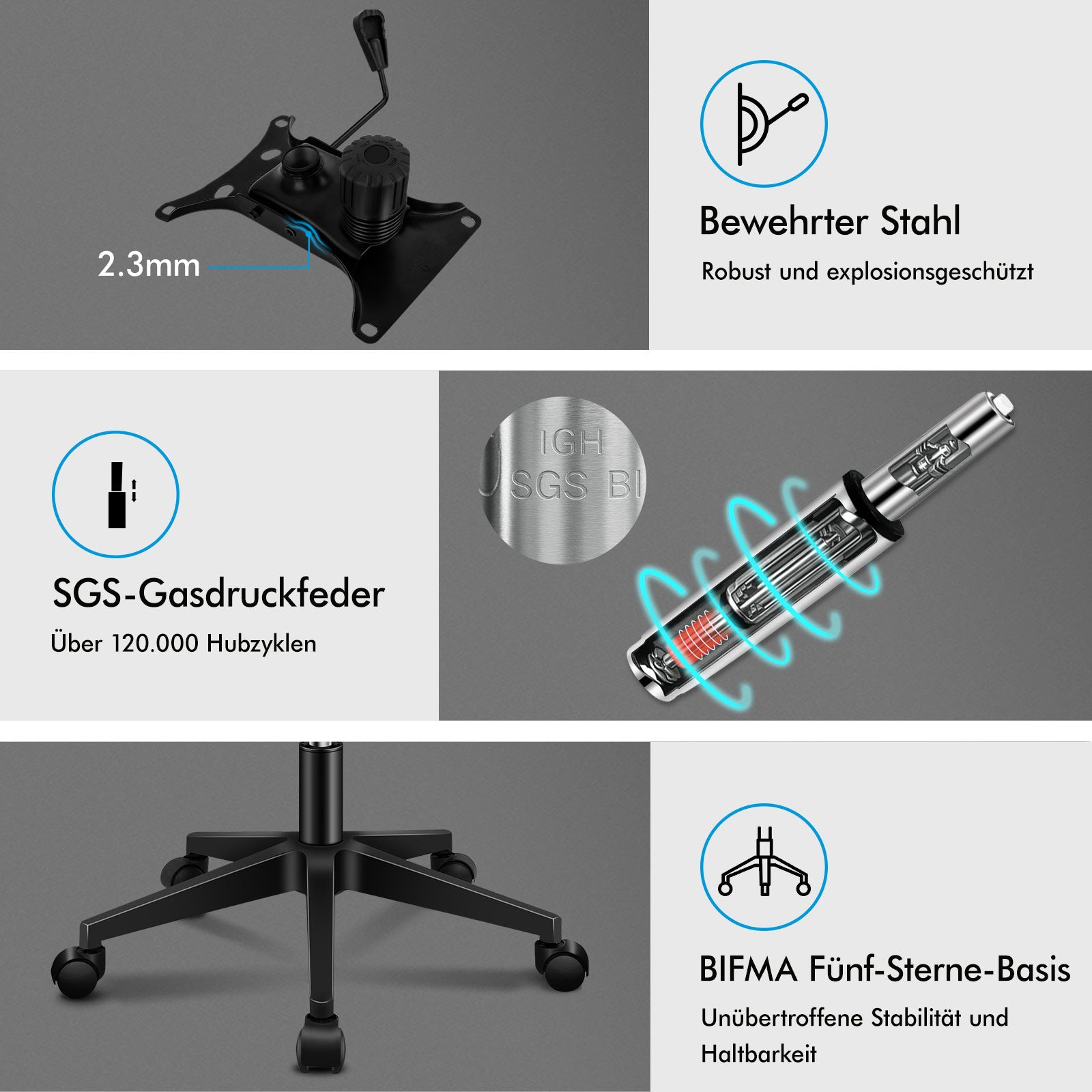 Spezifikationen* Intertek-geprüftes, hochwertiges Netzgewebe * SGS-geprüfte Gasdruckfeder, keine Explosionsgefahr * TÜV-geprüfte Lenkrollen * Dreischichtiger Sitz: Netzgewebe + elastischer Schaumstoff + Holzplatte * Hohe Gewichtskapazität: 180 kg * Garantie: 2 Jahre * Farbe: Schwarz * Abmessungen: 63 x 63 x 112~128 cm * Detaillierte Größenangaben finden Sie auf dem Maßfoto