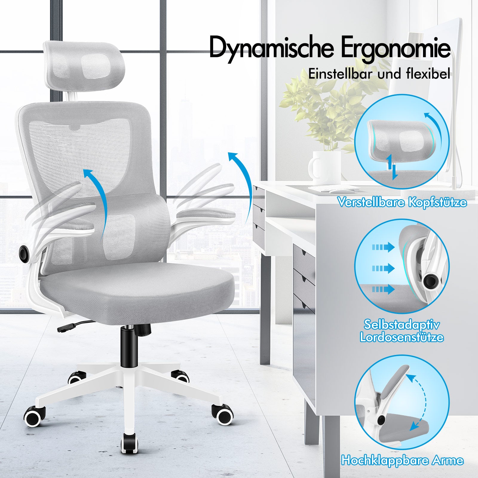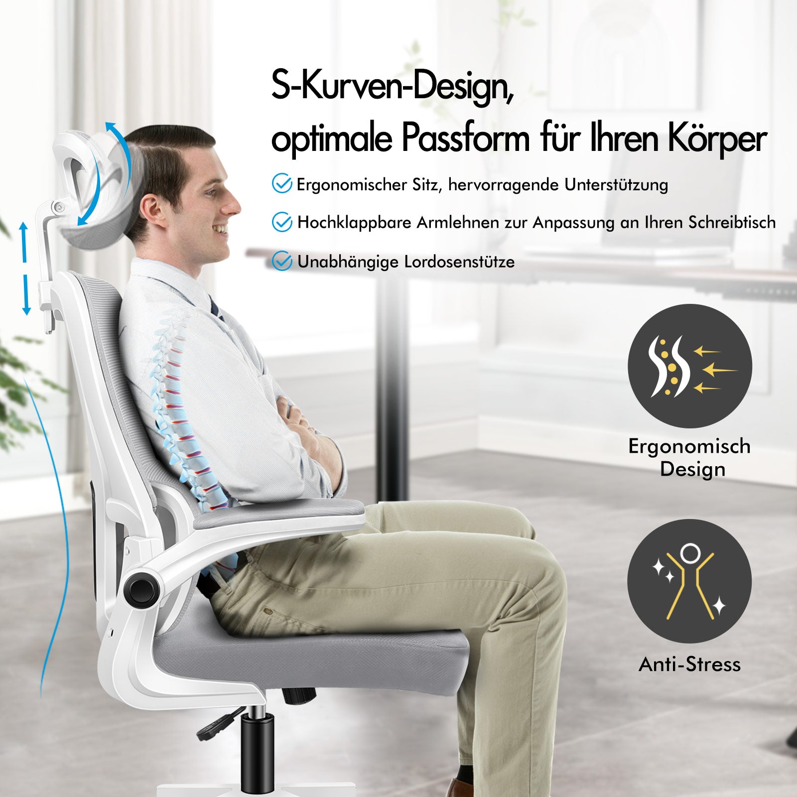 * Selbstanpassende Lendenwirbelstütze für optimalen Komfort* S-förmiges Design für optimale Körperanpassung * Winkel- und höhenverstellbare Kopfstütze* Entfernen Sie die Kopfstütze, wenn Sie einen Stuhl mit mittelhoher Rückenlehne bevorzugen* Netzrückenlehne und Stoffsitzpolsterung, hoch atmungsaktiv * Einziehbare Armlehnen für die Montage unter Ihrem Schreibtisch * Stilvolle Armlehnen mit Polsterung, breit und stützend * Großzügige Polsterung mit hochelastischem Schaumstoff * Entlastet Rücken- und Schulterdruck * Flexible Neigungsverstellung * Breitere und höhere Rückenlehne, wir kürzen sie nicht, um Kosten zu sparen* Hochwertige Universalräder, ein reibungsloses Erlebnis * Nylonbasis in einzigartiger geschwungener Form * Sanfte 360-Grad-Drehung * Robuste Materialien aus Metall und Nylon * Ideal für das Homeoffice, Gamer und den geschäftlichen Einsatz
