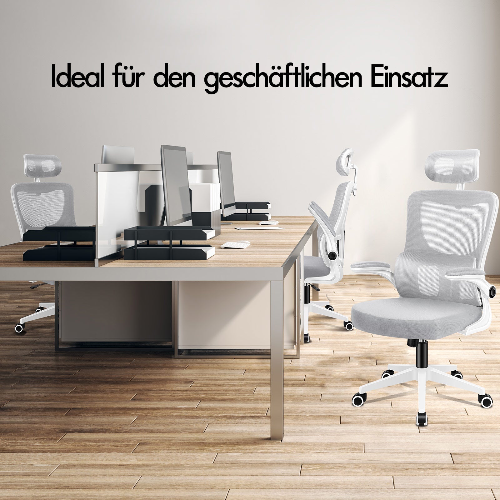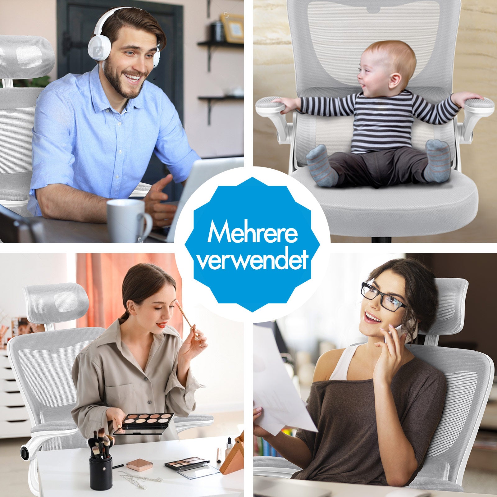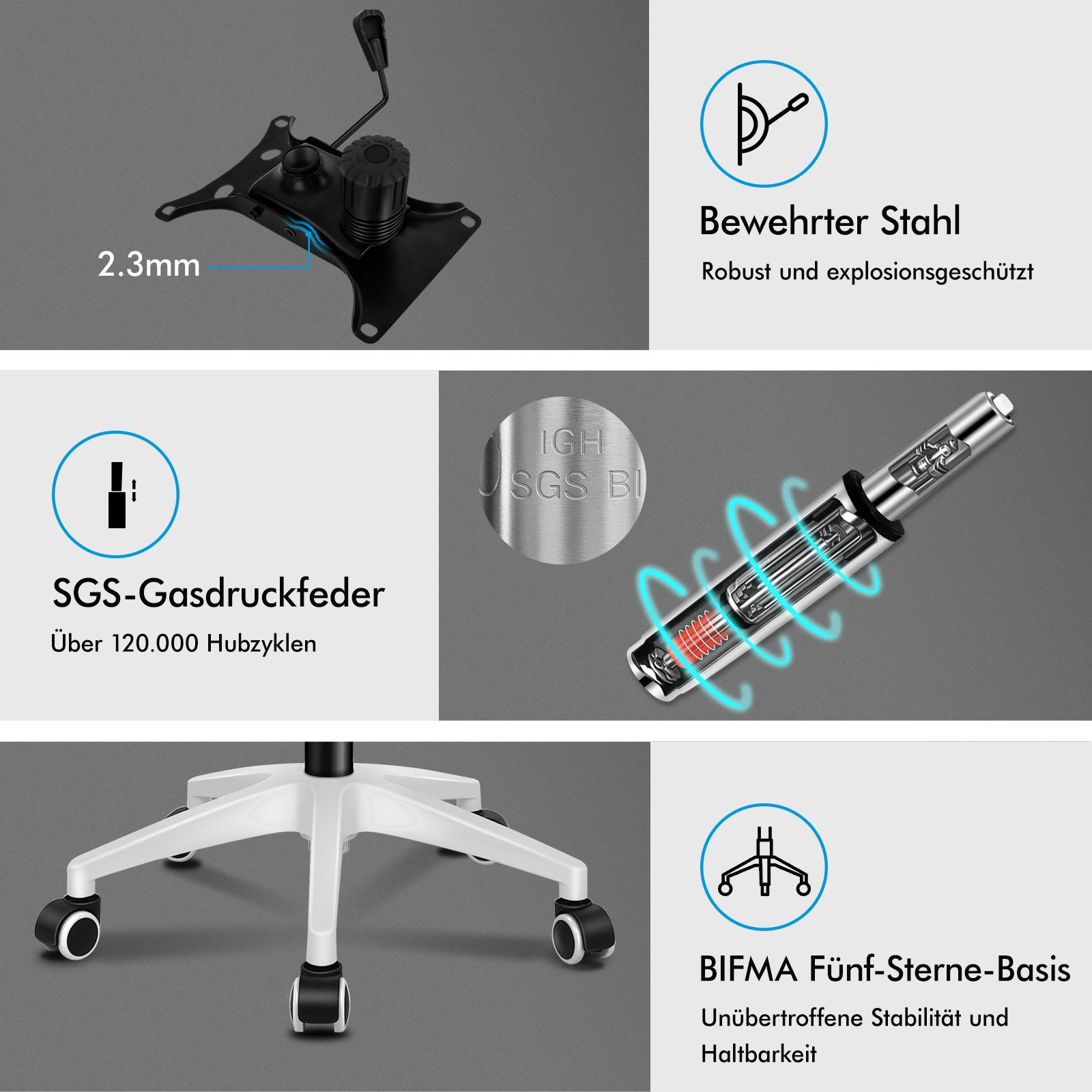 Spezifikationen* Intertek-geprüftes, hochwertiges Netzgewebe * SGS-geprüfte Gasdruckfeder, keine Explosionsgefahr * TÜV-geprüfte Lenkrollen * Dreischichtiger Sitz: Netzgewebe + elastischer Schaumstoff + Holzplatte * Hohe Gewichtskapazität: 180 kg * Garantie: 2 Jahre * Farbe: Weiß und Grau * Abmessungen: 63 x 63 x 112~128 cm * Detaillierte Größenangaben finden Sie auf dem Maßfoto