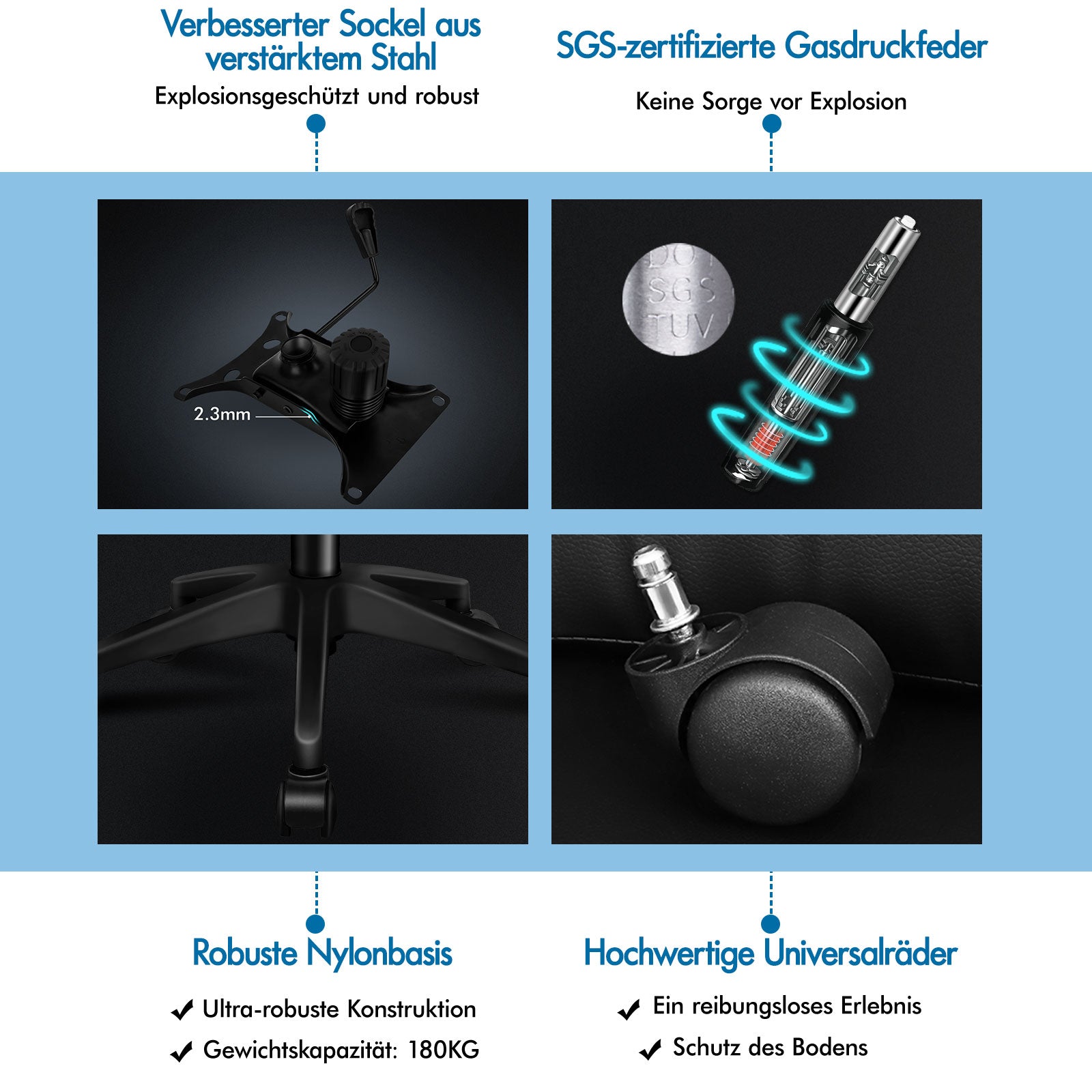 * Netzrücken & Sitzpolsterung aus Stoff* Hoch atmungsaktiv * Winkel & Höhe verstellbare Kopfstütze*Entfernen die Kopfstütze, wenn Sie einen Stuhl mit niedriger Rückenlehne bevorzugen* Ausziehbare Armlehnen, die unter Ihren Schreibtisch passen* Integrierte Lordosenstütze* Robustes Metall & PP-Materialien * S-Kurven-Design, beste Passform für Ihren Körper * Keine Kompromisse bei den Materialien, wir verwenden keinen recycelten Schaumstoff* Großzügige Schaumstoffpolsterung, wir machen es nicht dünn, um Geld zu sparen * Flexible Neigungsverstellung * Premium-Universalräder, ein reibungsloses Erlebnis * Nylonbasis in einzigartiger geschwungener Form* Reibungslos um 360 Grad drehbar * Stilvolle Armlehnen aus PP-Kunststoff * Beseitigt Rücken- und Schulterdruck * Ideal für Gamer, Heimbüros und geschäftliche Zwecke