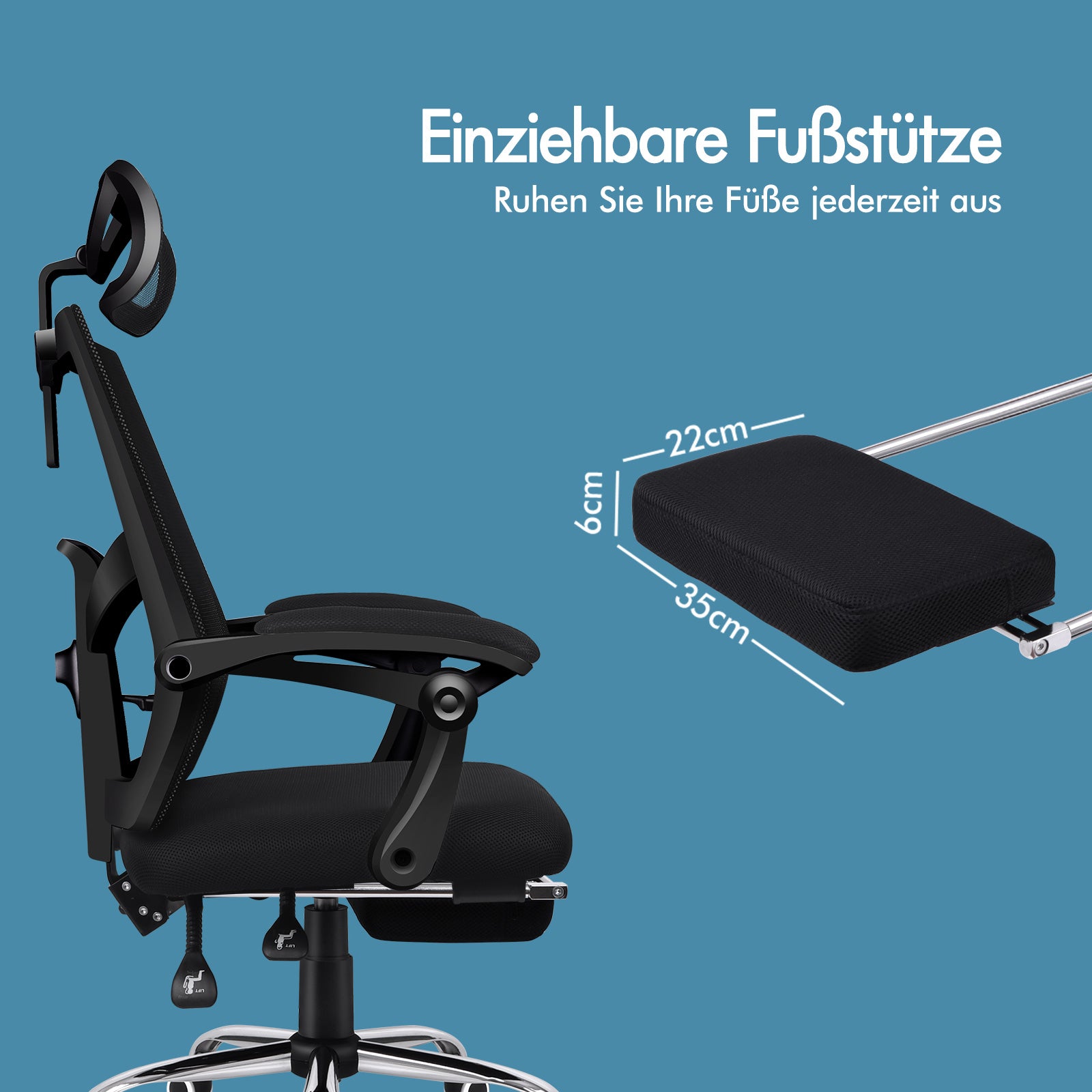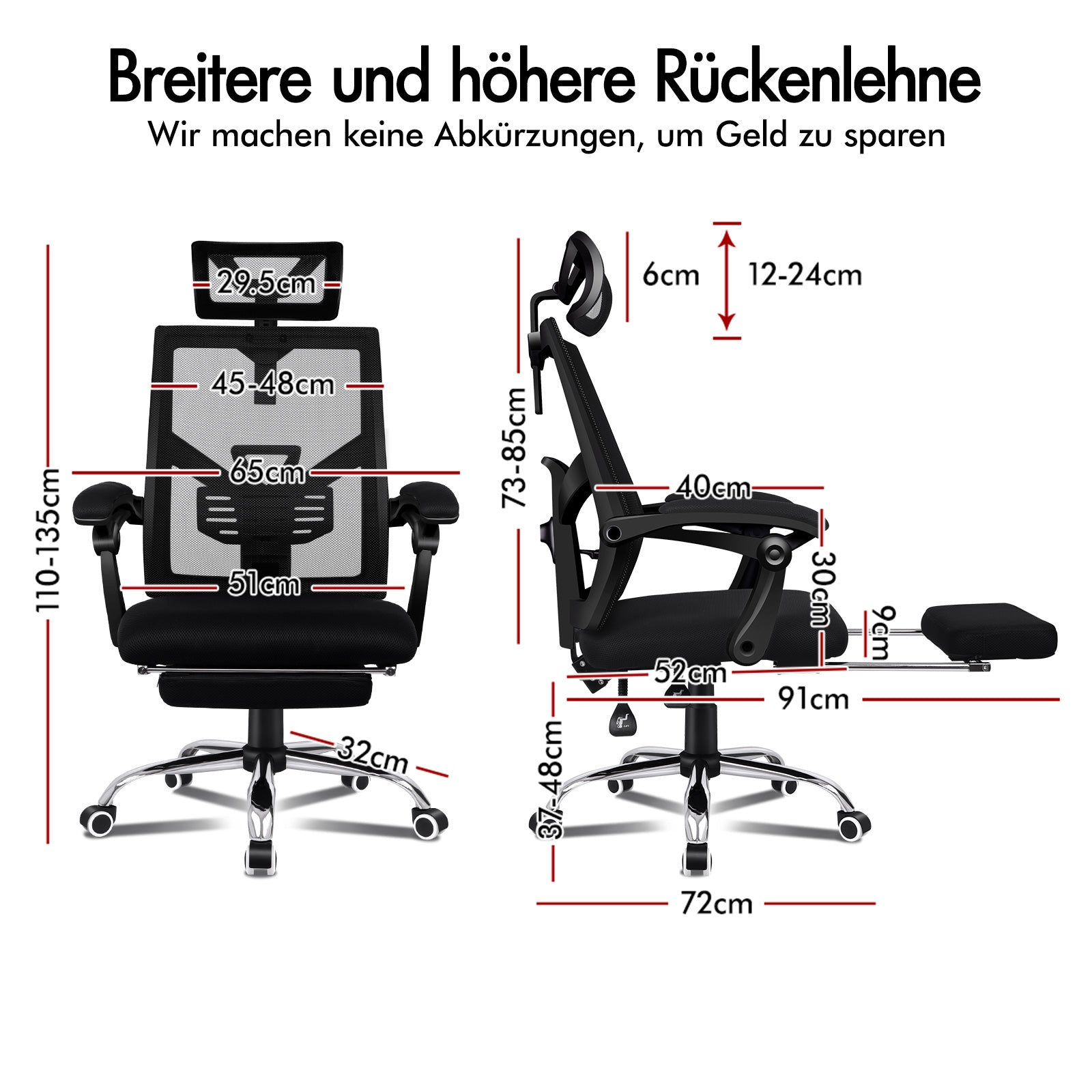 * Netzrücken und Sitzpolsterung aus Stoff* Hoch atmungsaktiv * Winkel- und höhenverstellbare Kopfstütze* Entfernen Sie die Kopfstütze (schrauben Sie sie ab), wenn Sie einen Stuhl mit niedriger Rückenlehne bevorzugen* Höhenverstellbare Lendenwirbelstütze* Robuste Metall- und PP-Materialien * S-Kurven-Design, beste Passform für Ihren Körper * Keine Kompromisse bei den Materialien, wir verwenden keinen recycelten Schaumstoff* Großzügige Schaumstoffpolsterung, wir schneiden sie nicht zu dünn, um Geld zu sparen * Bis zu 150 Grad Neigungsverstellung der Rückenlehne * Die Liegeposition kann arretiert werden * Breiter und höhere Rückenlehne, wir haben sie nicht gekürzt, um Kosten zu sparen* Einziehbare, gepolsterte Fußstütze* Hochwertige Universalräder, ein reibungsloses Erlebnis * Deluxe-Neigungsverstellung* Sanfte 360-Grad-Drehung * Deluxe-Armlehnen aus PP-Kunststoff mit Polsterung, breit und stützend * Hochelastischer Schaumstoff * Eliminiert Rücken- und Schulterdruck * Stabiler Chromfuß, wird nicht so leicht schmutzig wie ein Kunststofffuß * Ideal für Gamer und geschäftliche Zwecke
