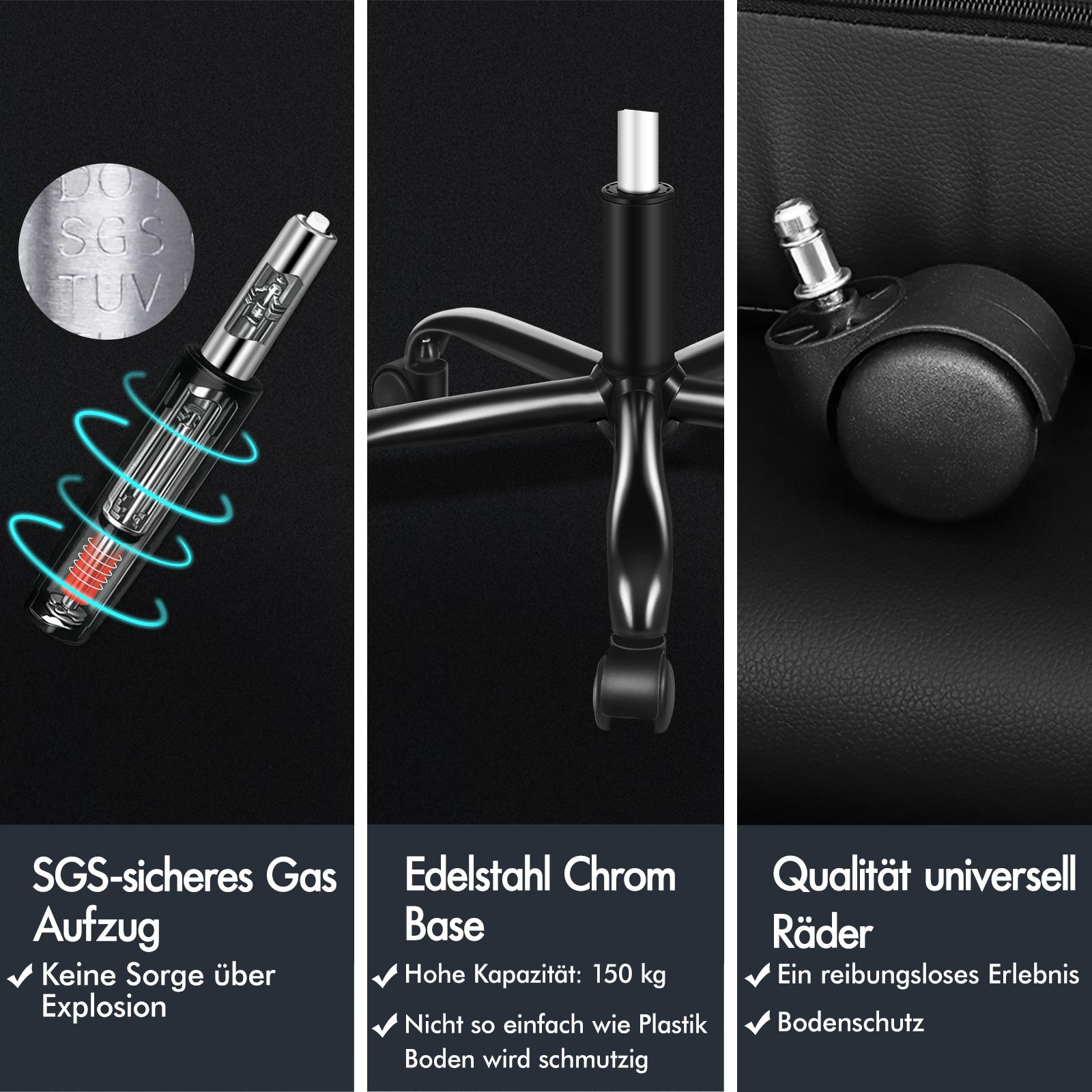 Eigenschaften* S-Kurven-Design, optimale Konturierung Ihres Körpers* Keine Kompromisse bei den Materialien* Wir verwenden keinen wiederverwerteten Schaumstoff und keine Holzplatten * Großzügige Schaumstoffpolsterung â€?eliminiert den Druck auf Rücken und Schultern * Mittlere Rückenpartie â€?einfache Bewegung * Verstellbare Armlehnen - platzsparend& leichtgängig* Ganzstück-Formschaum â€?bessere Gewichtsverteilung und Unterstützung * Deluxe-Neigungsverstellung - spannung einstellbar * 360-Grad-Schwenk - butterweich * Stabiler Chromfuß - schmutzabweisender als Kunststofffüße *Premium Universalrollen - bodenschonend und leichtgängig * Ideal für den Einsatz im Haushalt und im Gewerbe