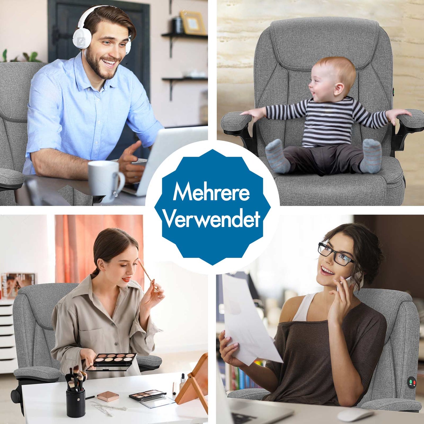 Spezifikationen * 5 Massagemodi * 2 Massagezonen: Rücken, Lendenwirbel * Einfache USB-Verbindung zur Stromquelle* Von Intertek zugelassener Leinenstoff höchster Qualität * SGS-geprüfter Gaslift, keine Explosionsgefahr * TÜV-geprüfte Lenkrollen * Sitzfläche aus drei Schichten: Leinenstoff + elastischer Schaumstoff + Holzplatte * Hohe Gewichtskapazität: 150kg * 2 Jahre Garantie* Farbe: Grau