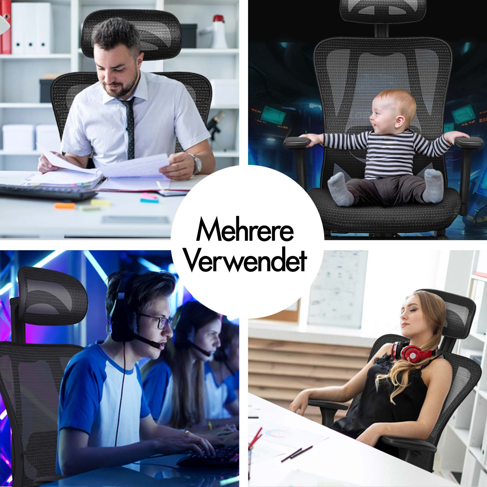 * Umfassende Unterstützung für optimalen Komfort * Verbesserte Rücken- und selbstanpassende Lendenwirbelstütze, eliminiert den Druck auf die Lendenwirbelsäule * 3D-Kopfstütze â€?Winkel-, Höhen- und Vorwärts-/Rückwärtsverstellung * Hochfeste AdvWeaveTM Netzpolsterung * Hoch atmungsaktiv & langlebig * Bis zu 150 Grad verstellbare Rückenlehne, kann im gewünschten Winkel arretiert werden * Flexible Neigungsfunktion, Einstellknopf zum Anpassen des Spannungsniveaus * 3D verstellbare Armlehnen mit innovativer PU-Oberfläche: 60 Grad Links- und Rechtsdrehung 7 cm in 7 Gängen auf & ab verstellbar 6 cm Vorwärts- und Rückwärtsverstellung * Höhenverstellung passend zu Ihren Bedürfnissen * Reibungslose 360-Grad-Schwenkbewegung * Einziehbare Fußstütze aus Nylon * Stilvoller Chromsockel, der weniger schmutzanfällig ist als Kunststoffsockel * Hochwertige Universalräder für reibungslose Mobilität * Ideal für Gamer, Home-Office und geschäftliche Zwecke