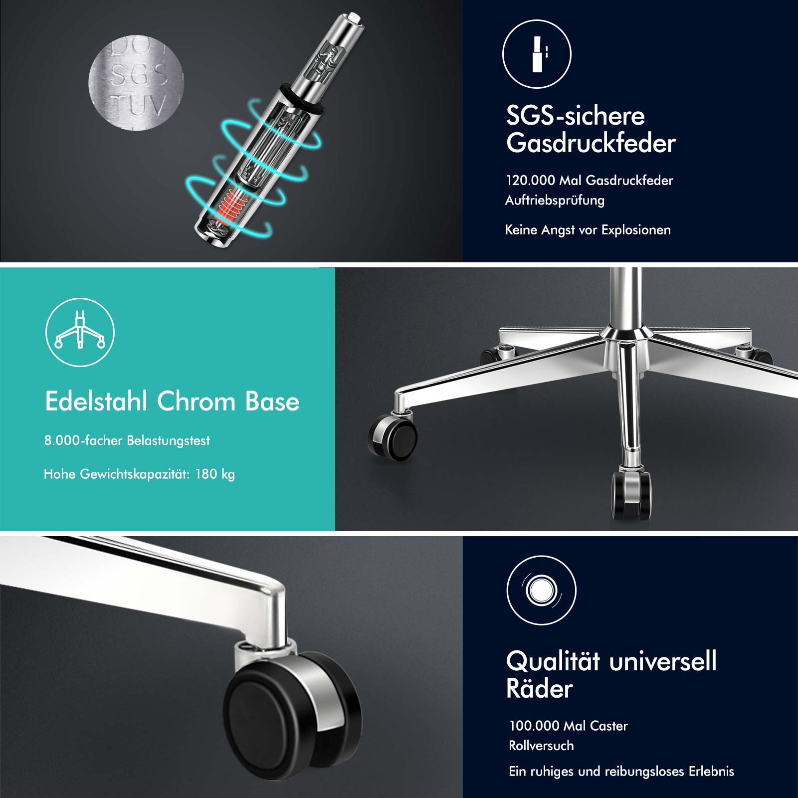 Spezifikationen * Robuste BIFMA-zertifizierte Materialien * Intertek-geprüftes, hochwertiges Netzgewebe * SGS-geprüfte Gasdruckfeder * TÜV-geprüfte Lenkrollen * Hohe Gewichtskapazität: 180 kg * Garantie: 2 Jahre * Farbe: Schwarz * Abmessungen: 72 x 72 x 112~130 cm * Detaillierte Größen siehe Maßfoto