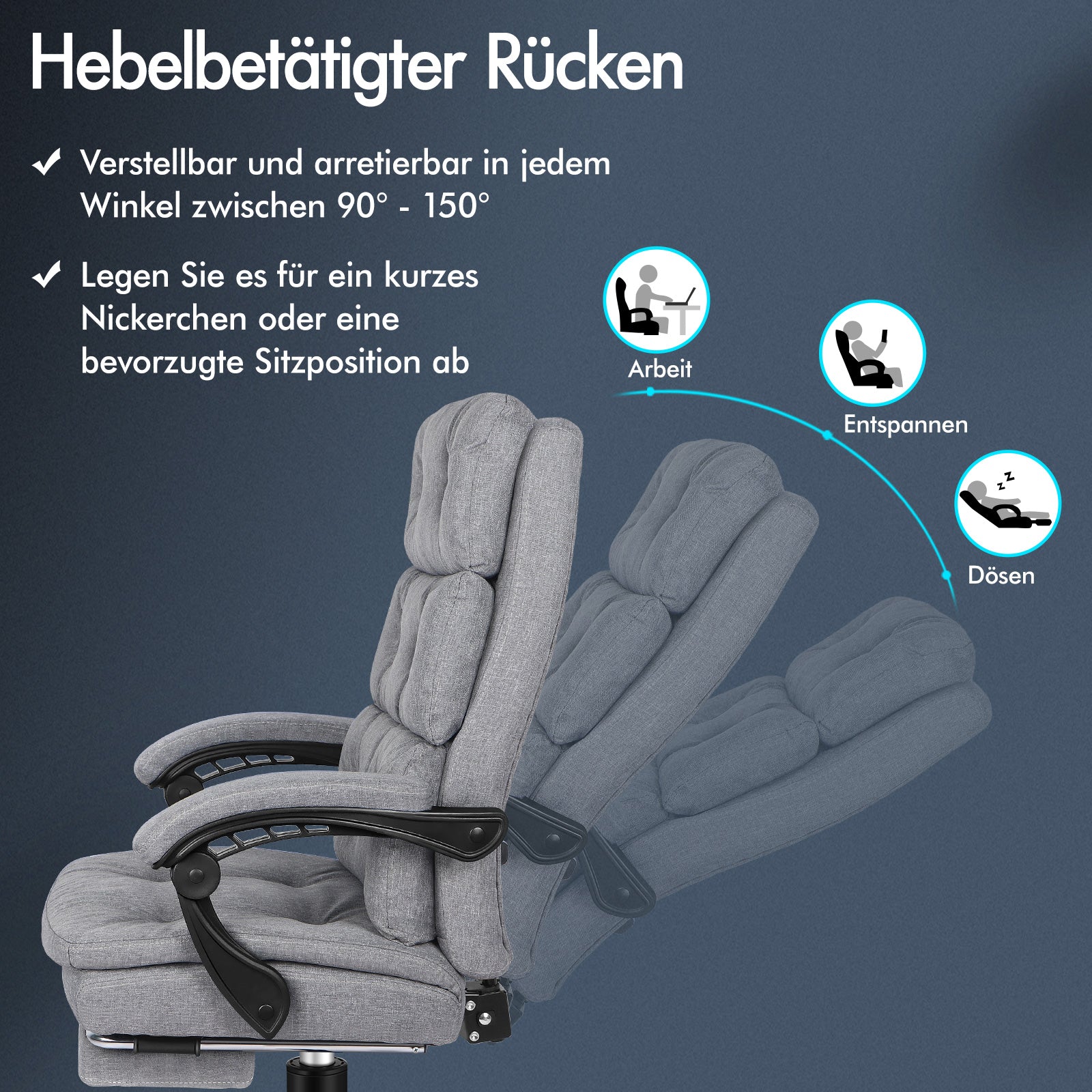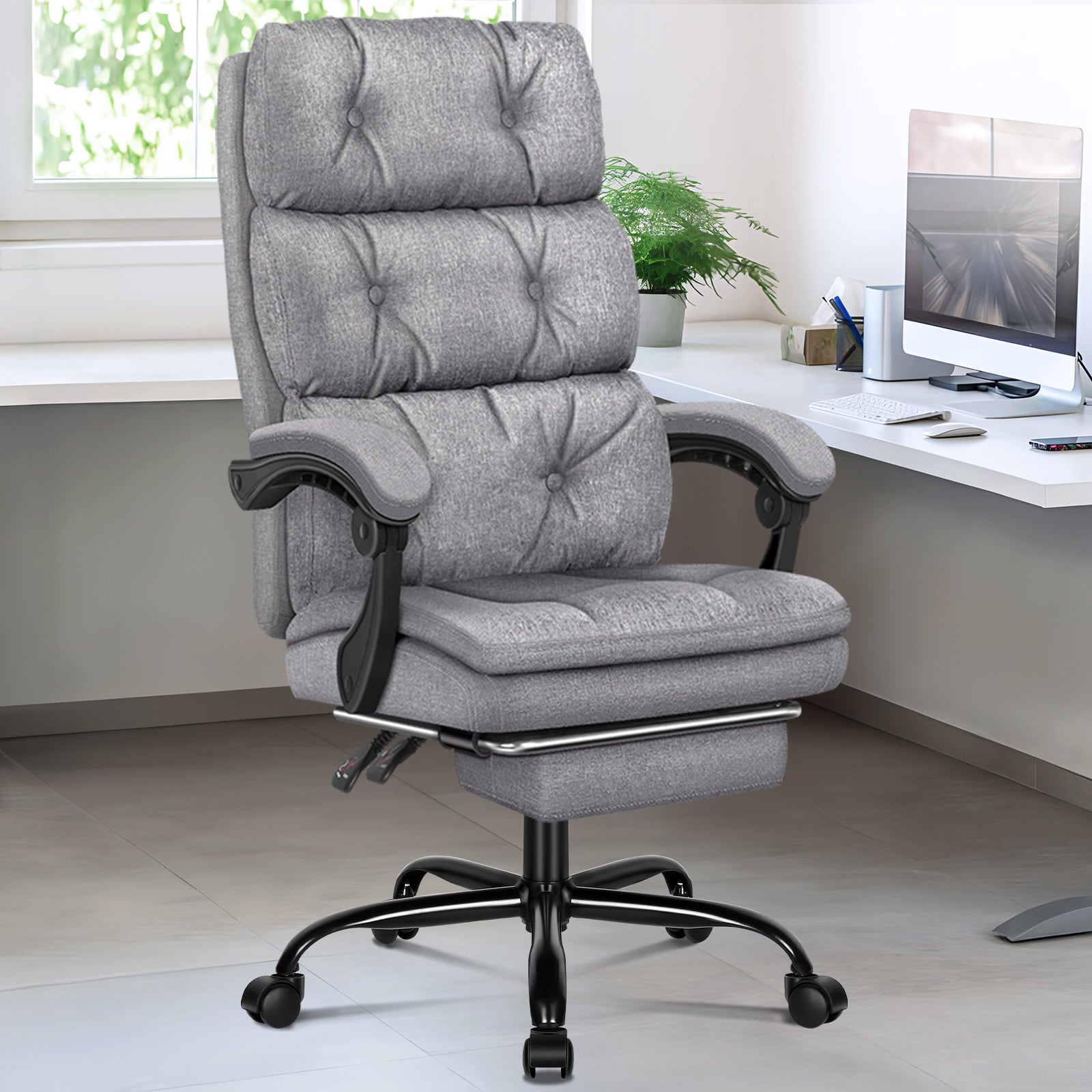 Spezifikationen * Von Intertek zugelassenes, hochwertiges Leinengewebe * SGS-zugelassener Gaslift, keine Angst vor Explosionen * TÜV-zugelassene Lenkrollen * Dreischichtiger Sitz: Leinenstoff + elastischer Schaumstoff + Holzbrett * Wir verwenden keinen recycelten Schaumstoff oder Holzbretter * Hohe Gewichtskapazität: 180kg * Garantie: 2 Jahre * Farbe: Grau
