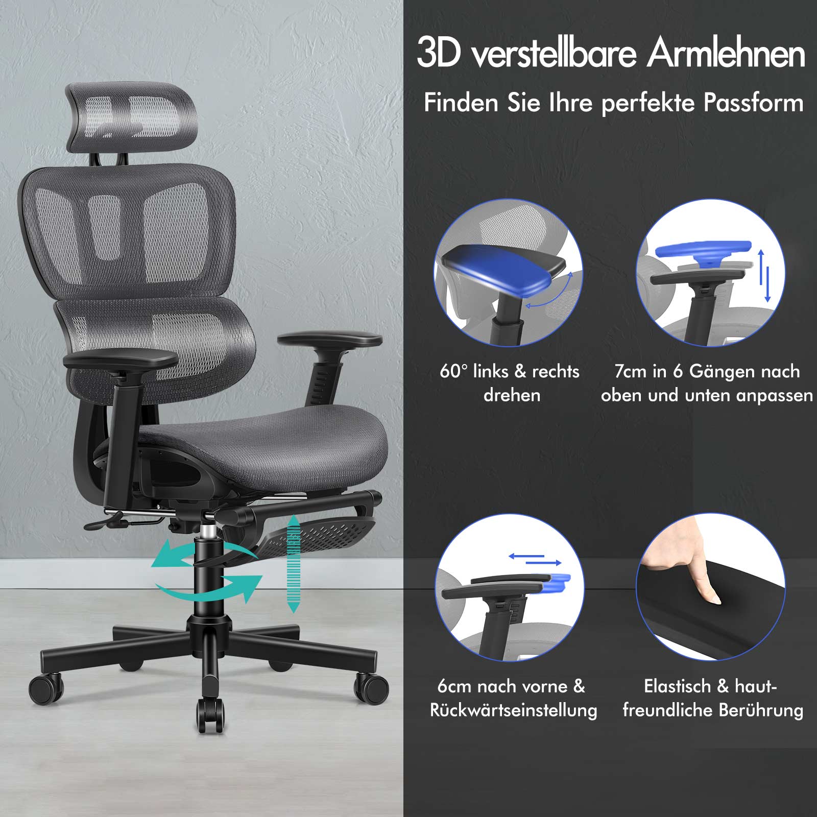* Umfassende Unterstützung für optimalen Komfort * S-Kurven-Design mit geteilter Rückenlehne und selbstanpassender Lendenwirbelstütze * Verbesserte Rückenstütze, eliminiert Druck im Lendenbereich * Hochfeste AdvWeaveâ„?Netzpolsterung * Äußerst atmungsaktiv und langlebig * Bis zu 150 Grad Rückenlehnenneigung, kann im gewünschten Winkel arretiert werden * Flexible Neigungsfunktion, Einstellknopf zum Anpassen des Spannungsniveaus * Winkel- und höhenverstellbare Kopfstütze * 3D-verstellbare Armlehnen mit innovativer PU-Oberfläche: 60 Grad Drehung nach links und rechts 7 cm in 6 Gängen aufwärts und abwärts Abwärtsverstellung 6 cm Vorwärts- und Rückwärtsverstellung * Höhenverstellung nach Bedarf * Sanfte 360-Grad-Schwenkbewegung * Einziehbare Fußstütze aus Nylon * Stilvoller Fuß aus schwarzem Chrom, der weniger schmutzanfällig ist als Kunststofffüße * Hochwertige Universalräder, reibungslose Mobilität * Ideal für Gamer, Homeoffice und geschäftliche Zwecke