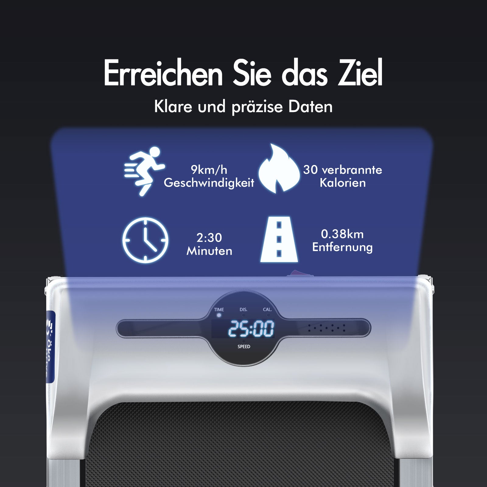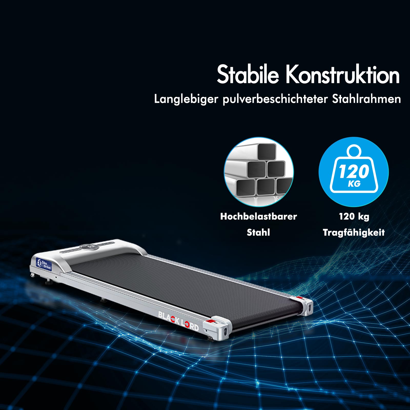 * 2,2 PS starker und energieeffizienter ÖkoDriveTM-Motor * Stabiler pulverbeschichteter Stahlrahmen* Kabellose Fernbedienung: Ein/Aus, Geschwindigkeitsregelung* Rutschfestes und verschleißfestes Laufband mit Diamantstruktur* Stoßdämpfung* Digitale LED-Anzeige – Geschwindigkeit, Distanz, Zeit und Kalorien* Bluetooth-APP-Steuerungsfunktion * Eingebauter Bluetooth-Lautsprecher* Leichtgängige Räder für Mobilität
