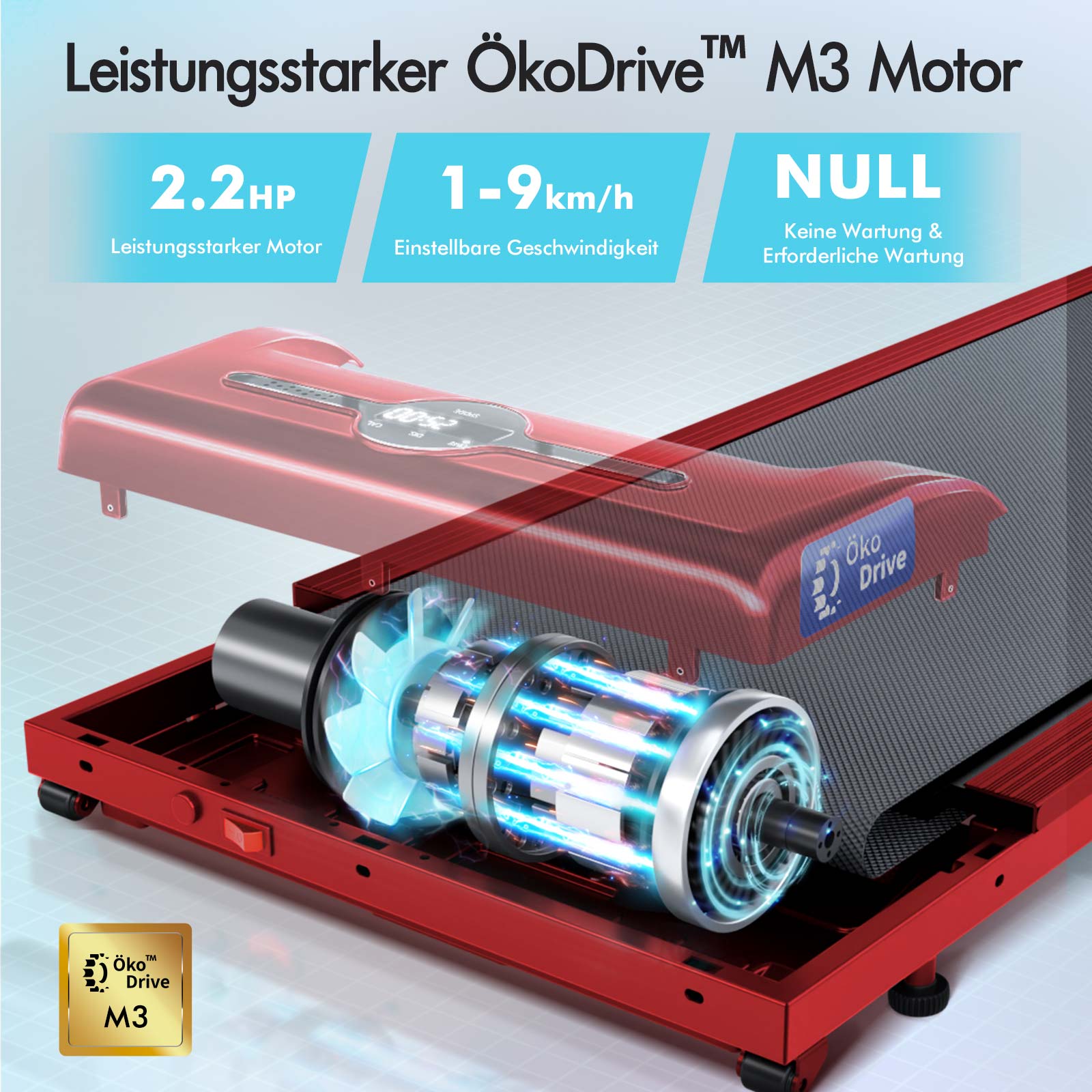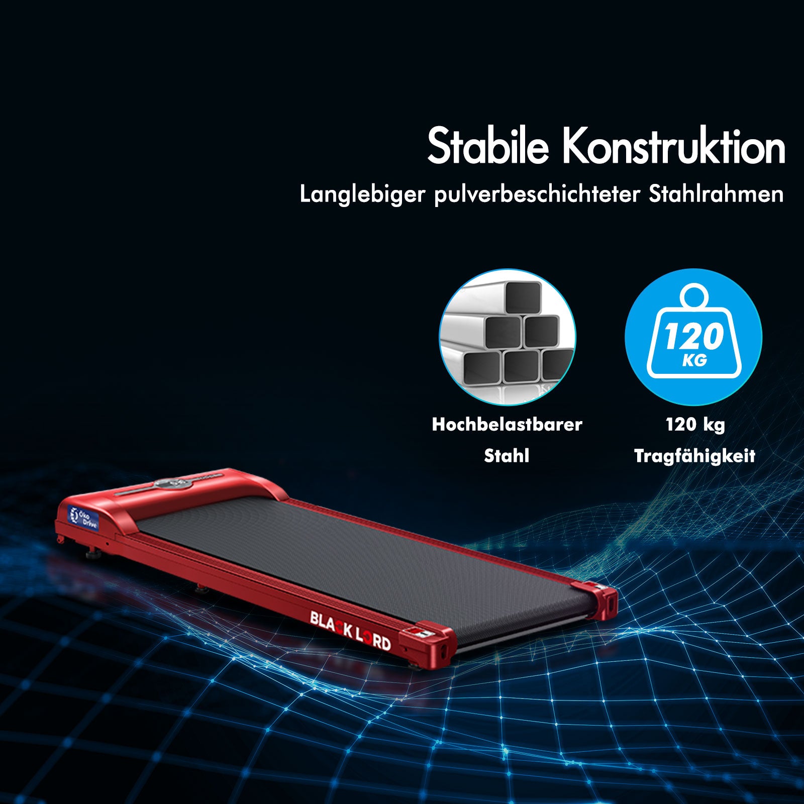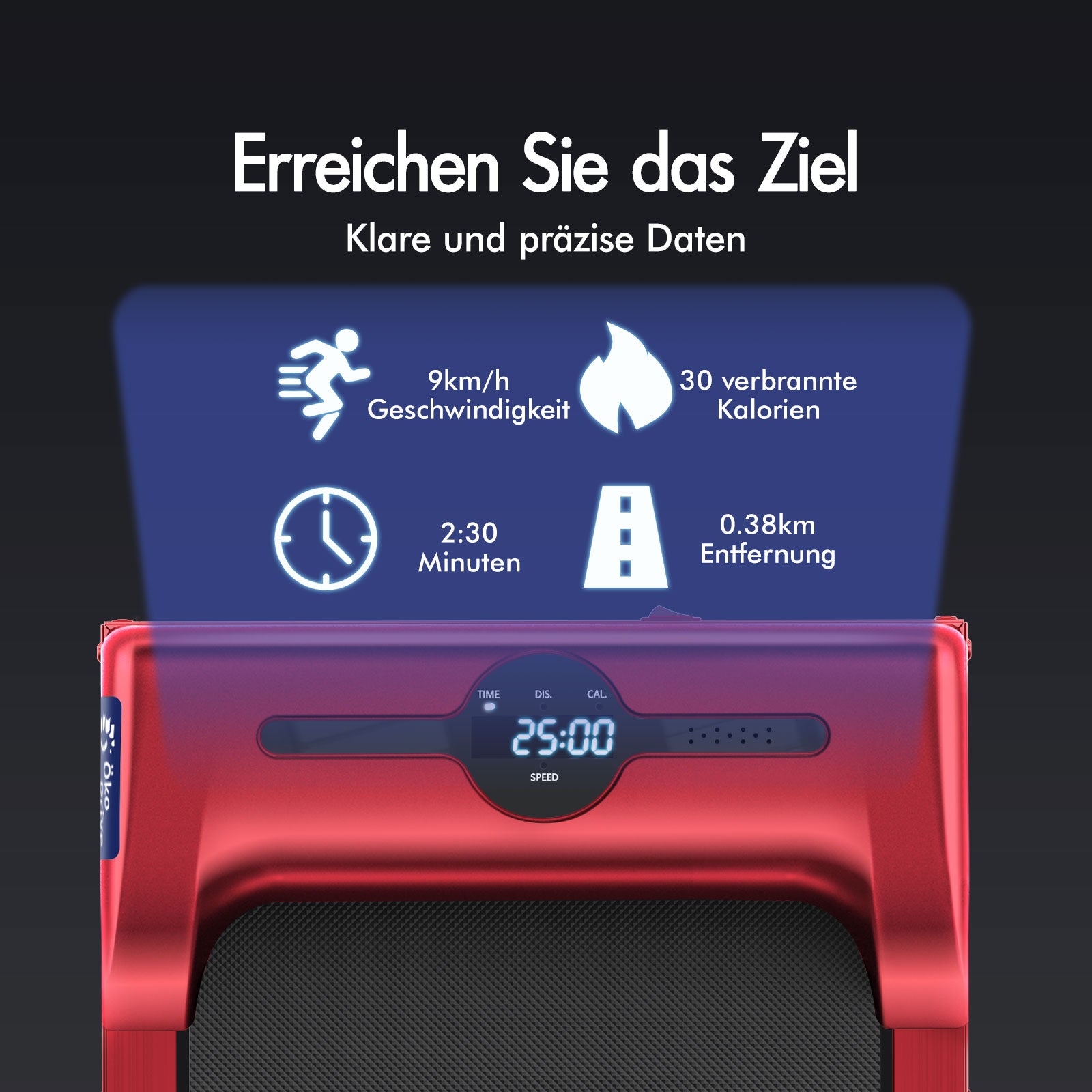 * 2,2 PS starker und energieeffizienter ÖkoDriveTM-Motor * Stabiler pulverbeschichteter Stahlrahmen* Kabellose Fernbedienung: Ein/Aus, Geschwindigkeitsregelung* Rutschfestes und verschleißfestes Laufband mit Diamantstruktur* Stoßdämpfung* Digitale LED-Anzeige – Geschwindigkeit, Distanz, Zeit und Kalorien* Bluetooth-APP-Steuerungsfunktion * Eingebauter Bluetooth-Lautsprecher* Leichtgängige Räder für Mobilität