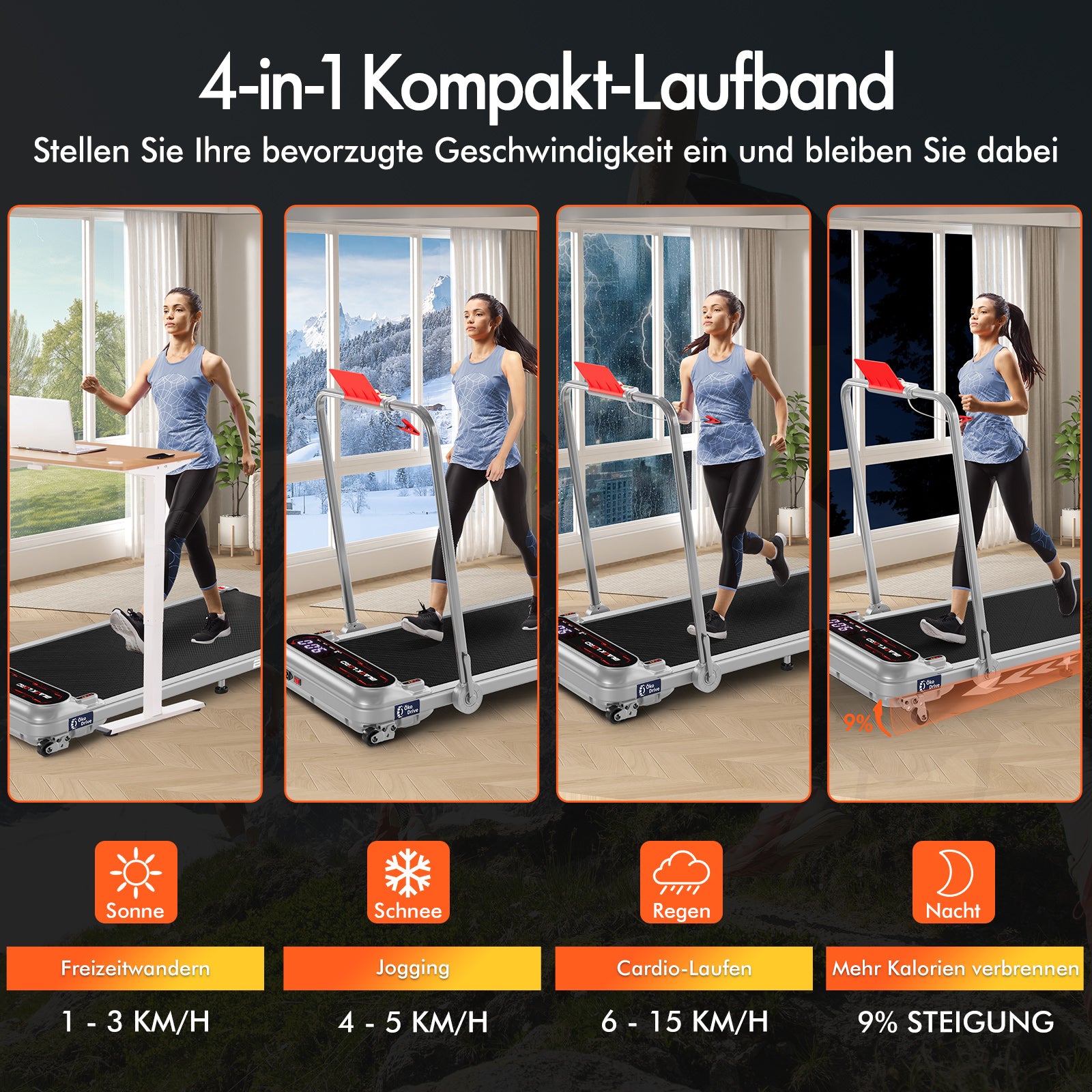Spezifikationen* Farbe: Silber* Spannung: AC 220–240 V, 50/60 Hz* Motorleistung: 3,0 PS* Geschwindigkeitsbereich: 1–11 km/h (bei eingeklapptem Handlauf)/1–15 km/h (bei aufrecht stehendem Handlauf)* Gewichtskapazität: 130 kg* Produktgröße: 114 cm x 58 cm x 104 cm* Laufbandgröße: 39 cm x 95 cm* Abmessungen: detaillierte Größenangaben siehe Maßfoto* Montage erforderlich: Ja