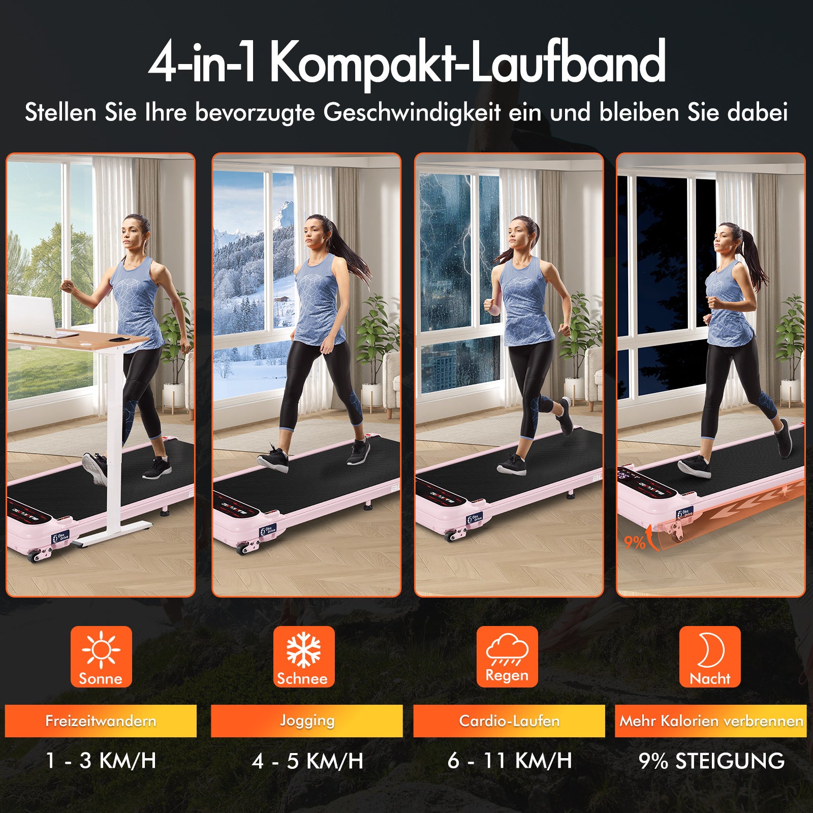 Spezifikationen* Spannung: AC 220–240 V, 50/60 Hz* Motorleistung: 3,0 PS* Geschwindigkeitsbereich: 1–11 km/h* Gewichtskapazität: 130 kg* Produktgröße: 114 cm x 52 cm x 11,5 cm* Laufbandgröße: 39 cm x 95 cm* Abmessungen: detaillierte Größenangaben siehe Maßfoto* Farbe: Rosa* Zusammenbau erforderlich: Ja