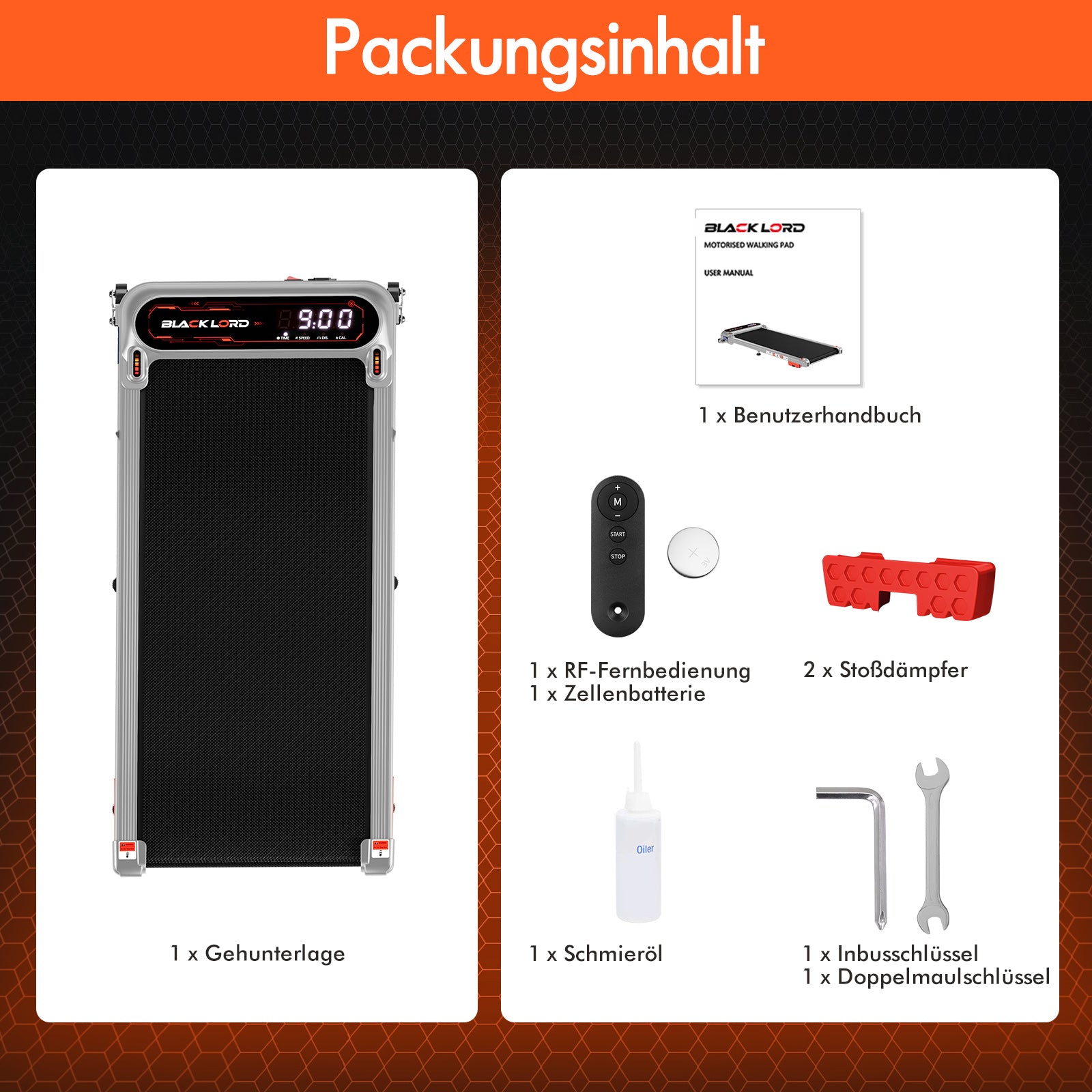 * 1 x BLACK LORD Laufband* 1 x Drahtlose Fernbedienung* 1 x Handbuch