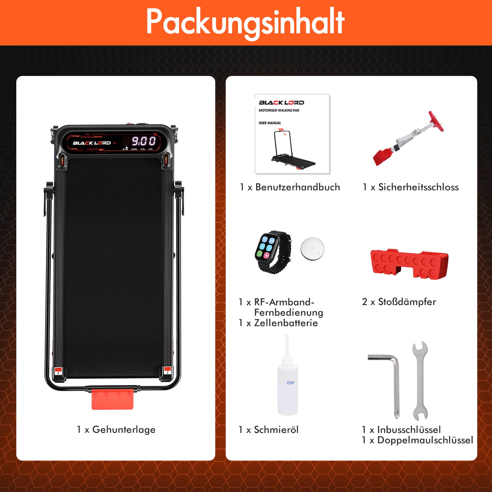 * 1 x BLACK LORD Laufband* 1 x Drahtlose Fernbedienung* 1 x Handbuch
