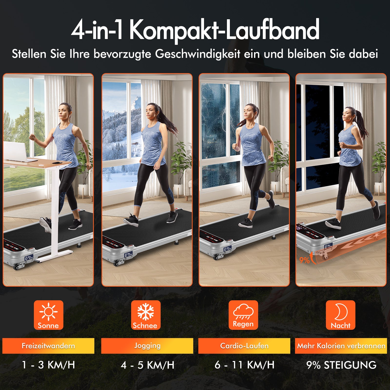 Das praktische Untertisch-Laufband hilft Ihnen außerdem, eintöniges Sitzen und Stehen auszugleichen und mehr Bewegung in Ihren Arbeitsalltag zu integrieren. Sie müssen nicht jeden Tag den ganzen Tag laufen, um auf der Straße und im Gelände Höchstleistungen zu erbringen. Dieses Laufband hält Sie beim E-Mail-Versand oder in Meetings aktiv und kurbelt mit jedem Schritt Ihren Stoffwechsel und Ihre Herz-Kreislauf-Fitness an. Egal, ob Sie im Büro mit einem Stehpult arbeiten oder sich beim Fernsehen zu Hause bewegen möchten – mit unserem Laufband erreichen Sie Ihr tägliches Schrittziel bei der Arbeit oder Unterhaltung.