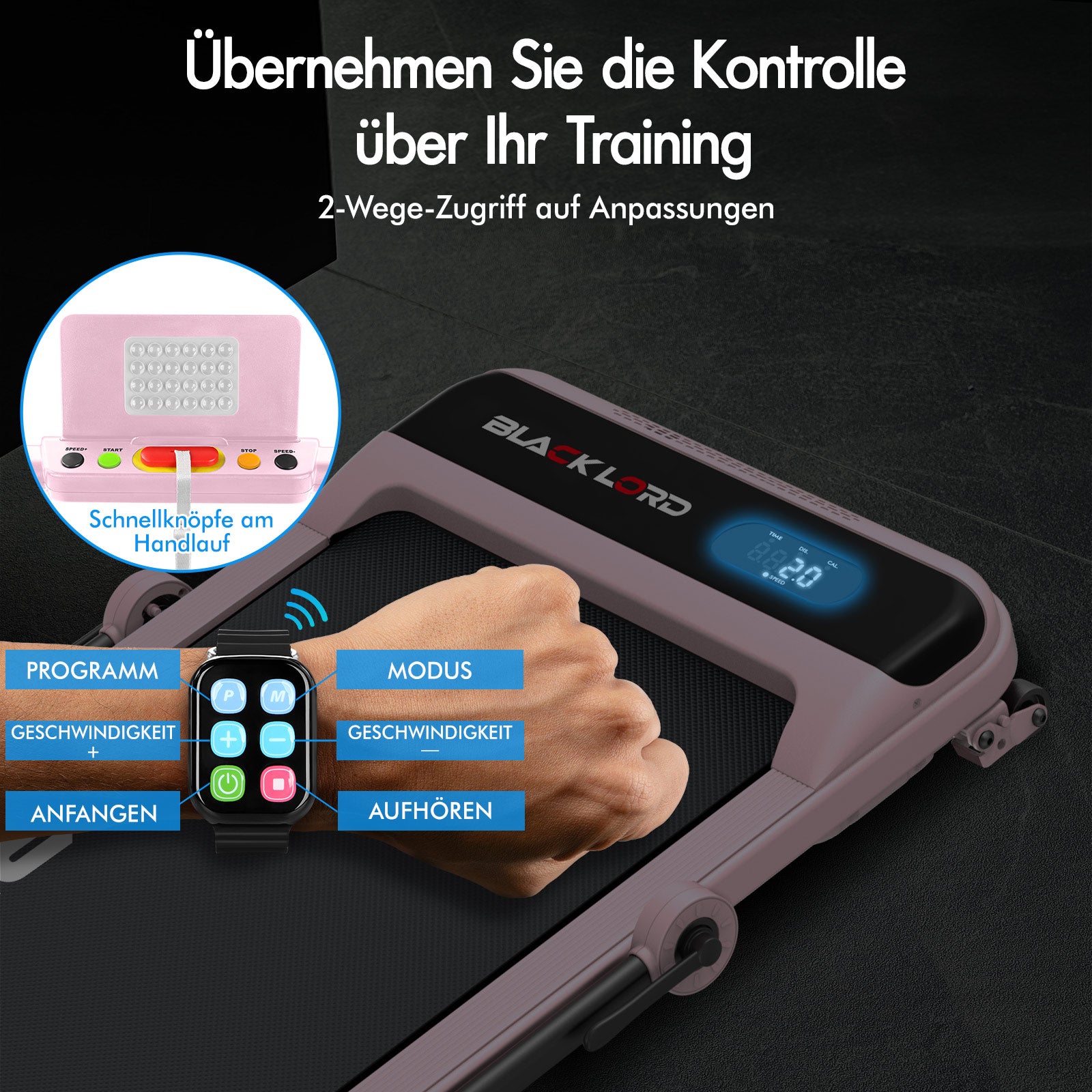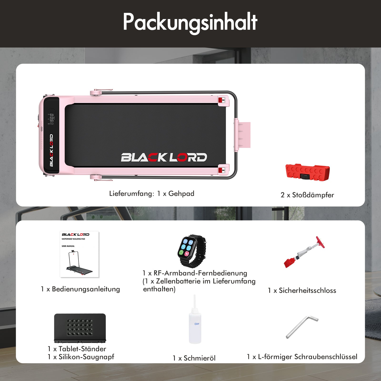 * 1 x BLACK LORD Tretmühle* 1 x Armbandfernbedienung* 1 x Handbuch