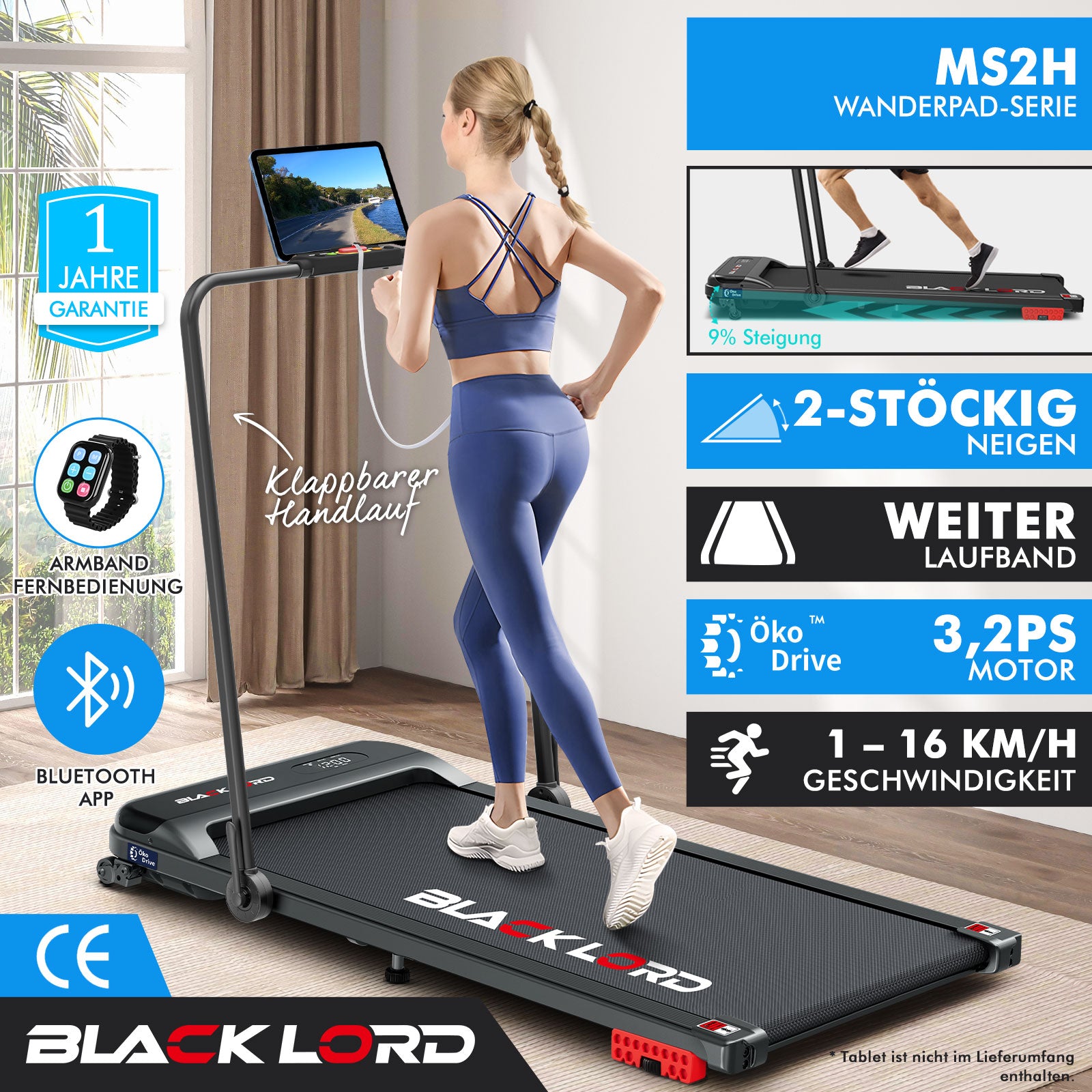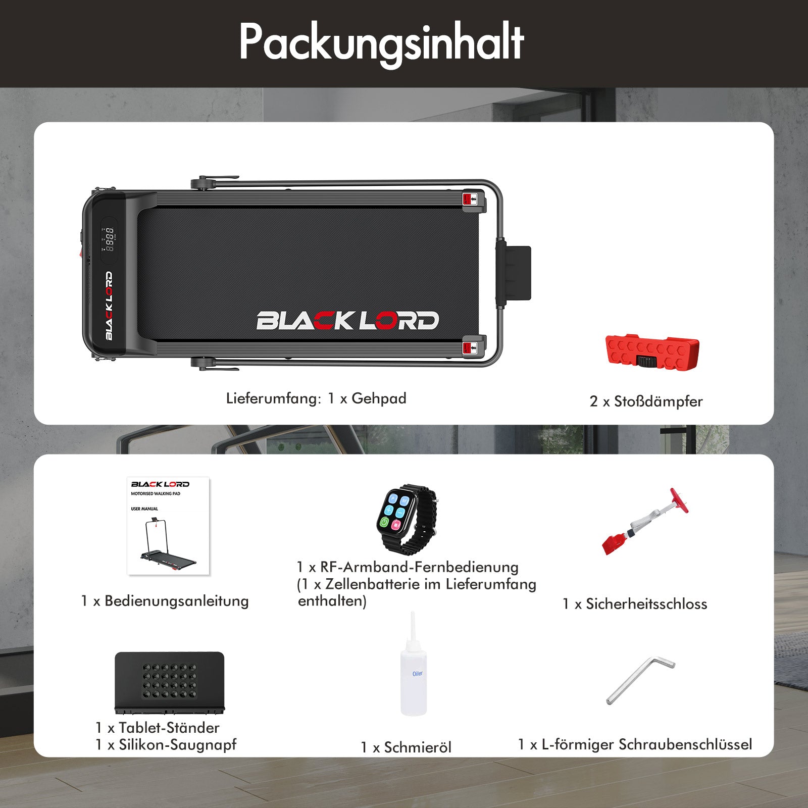 * 1 x BLACK LORD Tretmühle* 1 x Armbandfernbedienung* 1 x Handbuch